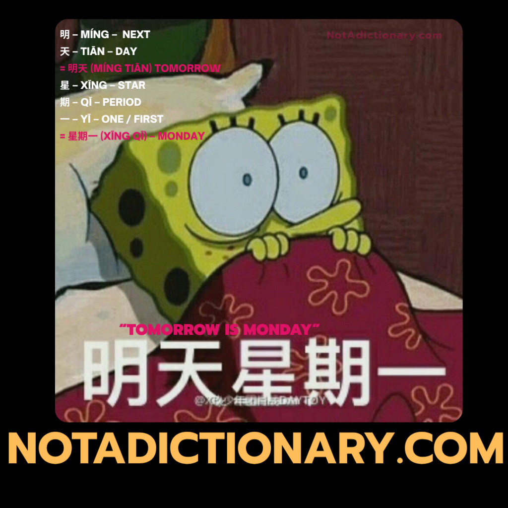 明天星期一 (míng tiān xīng qī yī) — Tomorrow is Monday